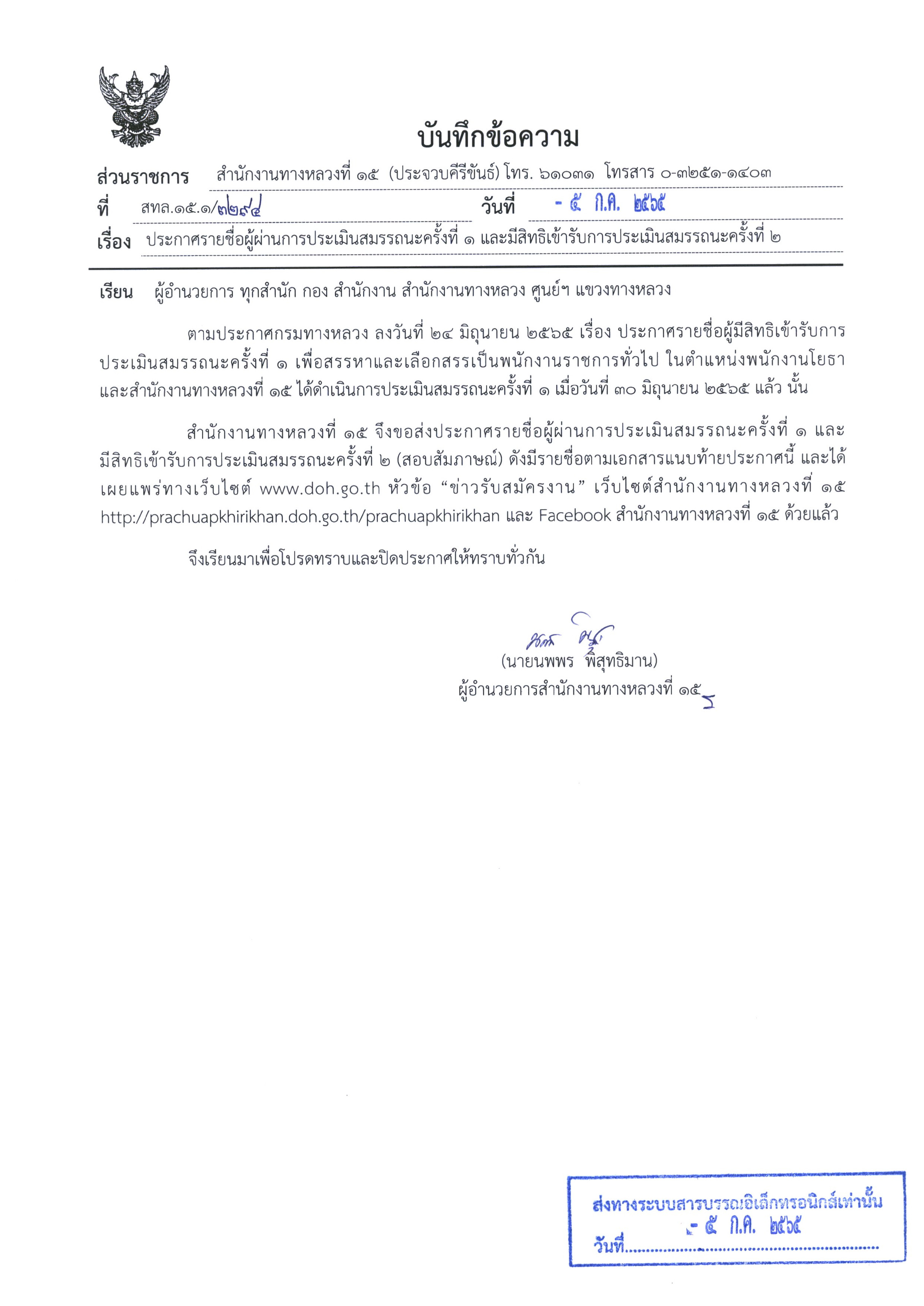 | ประกาศรายชื่อผู้มีสิทธิเข้ารับการประมินสมรรถะ กำหนด วัน เวลา และสถานที่ การประเมินสมรรถะ เพื่อเลือกสรรพนักงานราชการทั่วไป ตำแหน่งพนักงานโยธา 2 อัตรา สังกัดแขวงทางหลวงประจวบคีรีขันธ์ (หัวหิน) (ประกาศ ณ วันที่ 24 มิถุนายน 65) | 419 | ดาวน์โหลด |