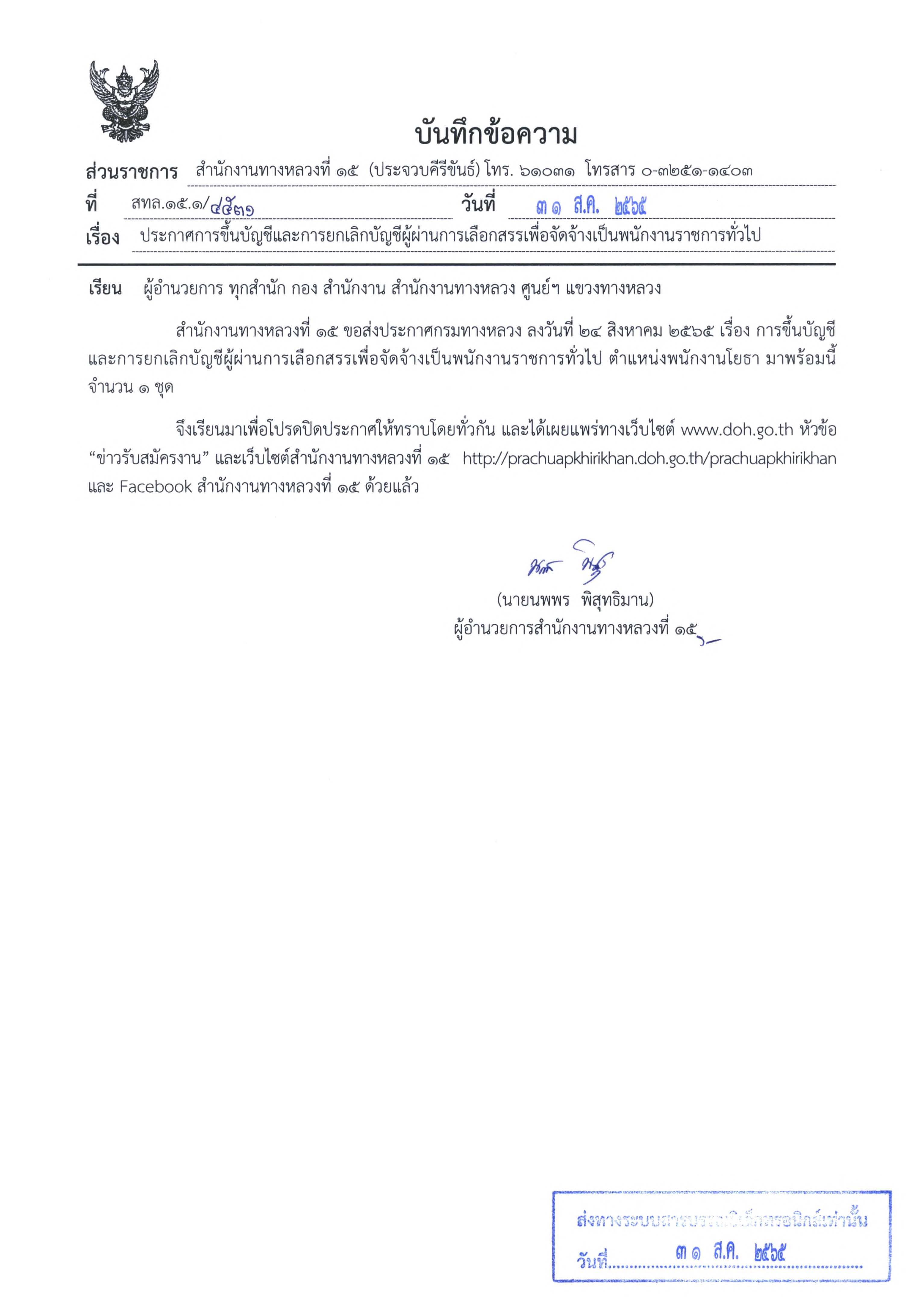 | ประกาศการขึ้นบัญชีและยกเลิกบัญชีรายชื่อผู้ผ่านการเลือกสรรเพื่อจัดจ้างเป็นพนักงานราชการทั่วไป ตำแหน่งพนักงานโยธา จำนวน 2 อัตรา (ประกาศ ณ วันที่ 31 สิงหาคม 65) | 349 | ดาวน์โหลด |