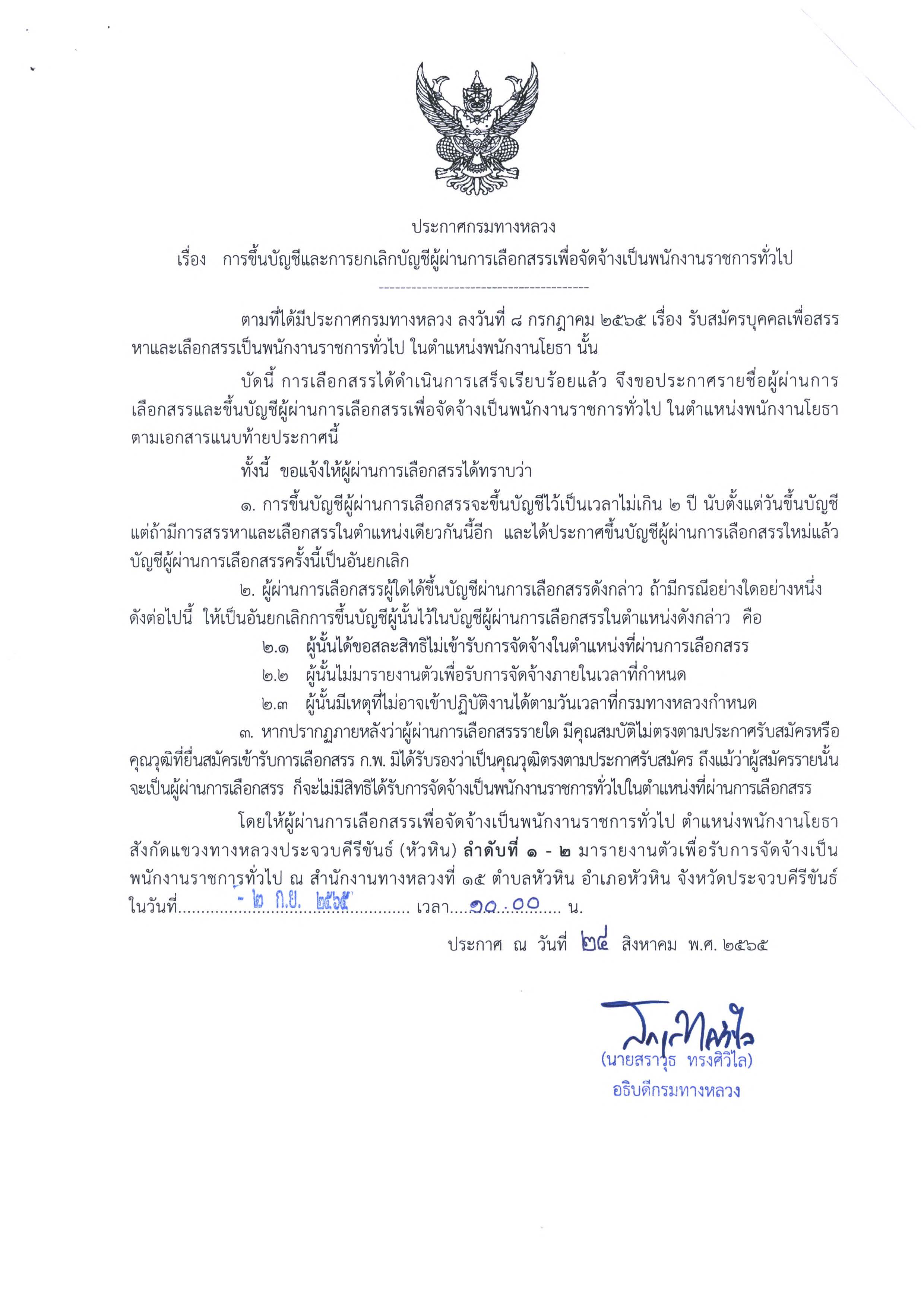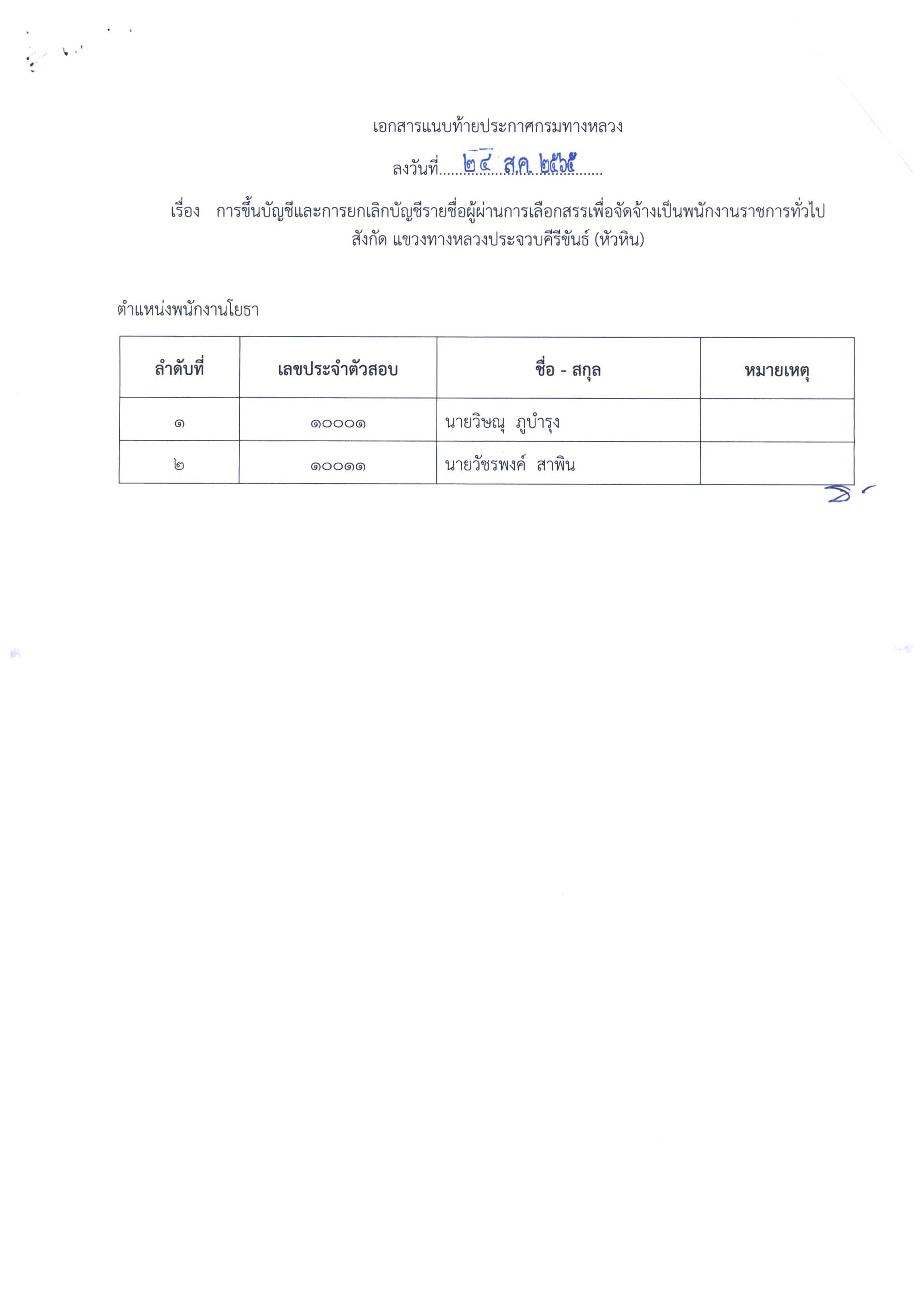 ประกาศการขึ้นบัญชีและยกเลิกบัญชีรายชื่อผู้ผ่านการเลือกสรรเพื่อจัดจ้างเป็นพนักงานราชการทั่วไป ตำแหน่งพนักงานโยธา จำนวน 2 อัตรา