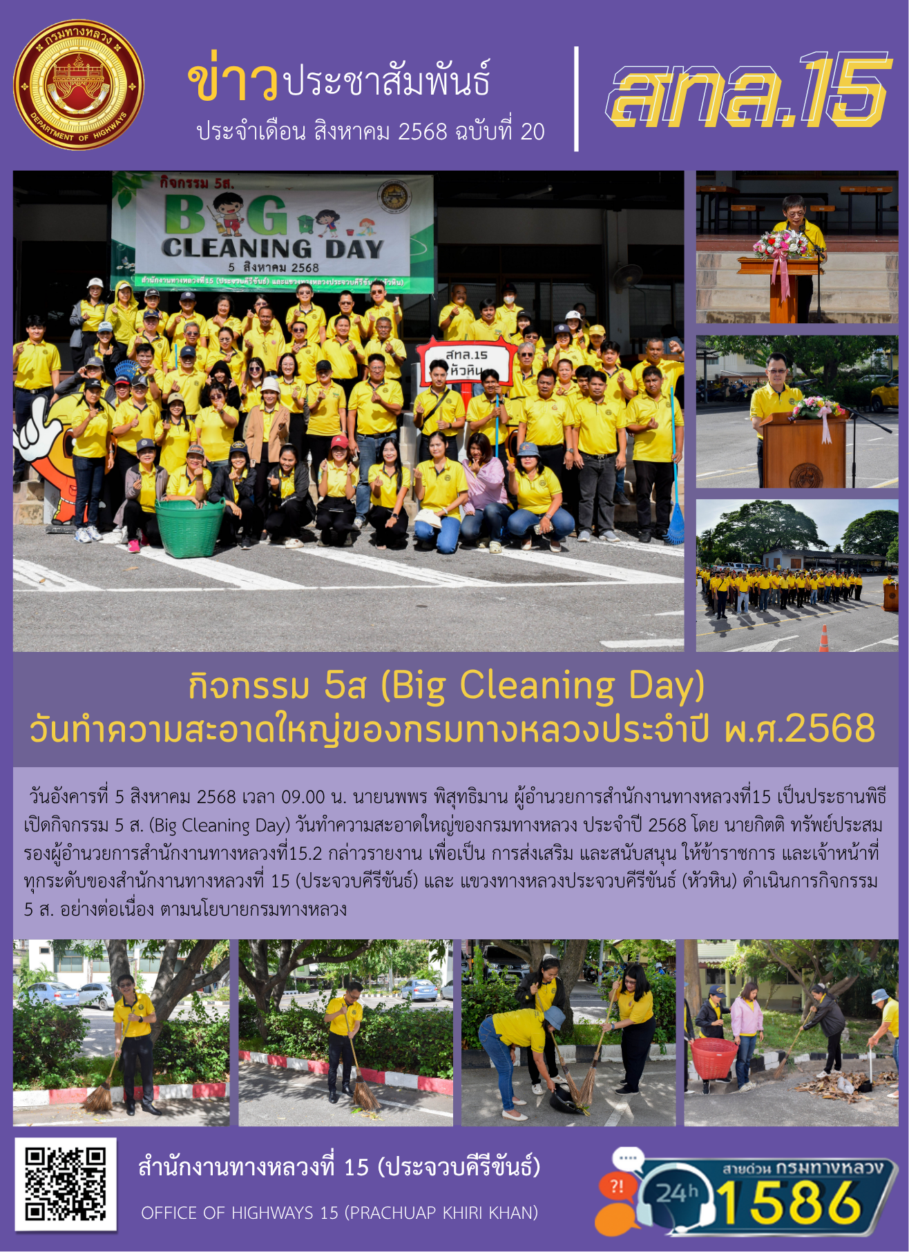 วันอังคารที่ 5 สิงหาคม 2568 เวลา 09.00 น. นายนพพร พิสุทธิมาน ผู้อำนวยการสำนักงานทางหลวงที่15 เป็นประธานพิธีเปิดกิจกรรม 5 ส. (Big Cleaning Day) วันทำความสะอาดใหญ่ของกรมทางหลวง ประจำปี 2568 โดย นายกิตติ ทรัพย์ประสมรองผู้อำนวยการสำนักงานทางหลวงที่15.2 กล่าวรายงาน เพื่อเป็น การส่งเสริม และสนับสนุน ให้ข้าราชการ และเจ้าหน้าที่ทุกระดับของสำนักงานทางหลวงที่ 15 (ประจวบคีรีขันธ์) และ แขวงทางหลวงประจวบคีรีขันธ์ (หัวหิน) ดำเนินการกิจกรรม 5 ส. อย่างต่อเนื่อง ตามนโยบายกรมทางหลวง