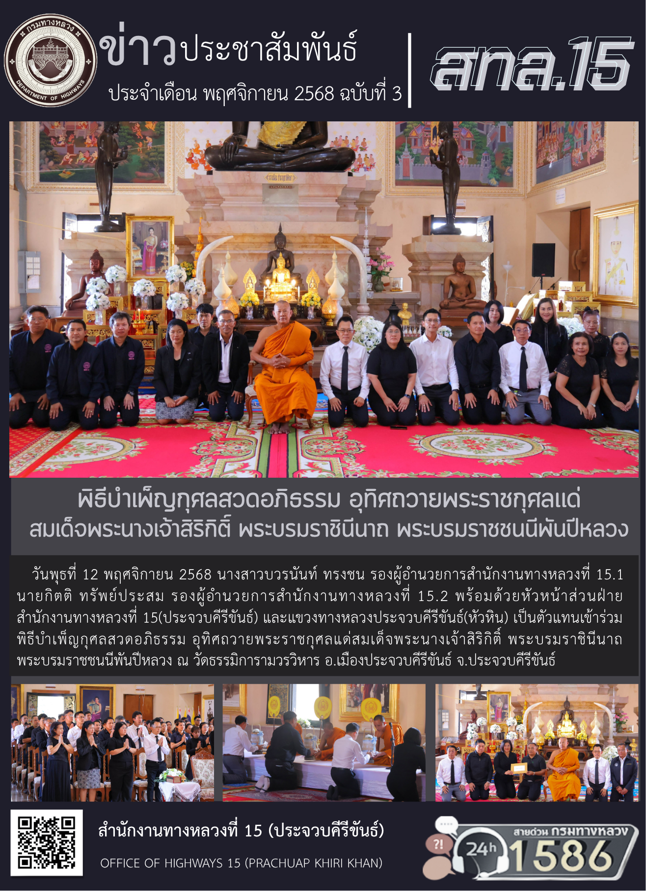 วันพุธที่ 12 พฤศจิกายน 2568 นางสาวบวรนันท์ ทรงชน รองผู้อำนวยการสำนักงานทางหลวงที่ 15.1 นายกิตติ ทรัพย์ประสม รองผู้อำนวยการสำนักงานทางหลวงที่ 15.2 พร้อมด้วยหัวหน้าส่วนฝ่าย สำนักงานทางหลวงที่ 15(ประจวบคีรีขันธ์) และแขวงทางหลวงประจวบคีรีขันธ์(หัวหิน) เป็นตัวแทนเข้าร่วม พิธีบำเพ็ญกุศลสวดอภิธรรม อุทิศถวายพระราชกุศลแด่สมเด็จพระนางเจ้าสิริกิติ์ พระบรมราชินีนาถ พระบรมราชชนนีพันปีหลวง ณ วัดธรรมิการามวรวิหาร อ.เมืองประจวบคีรีขันธ์ จ.ประจวบคีรีขันธ์