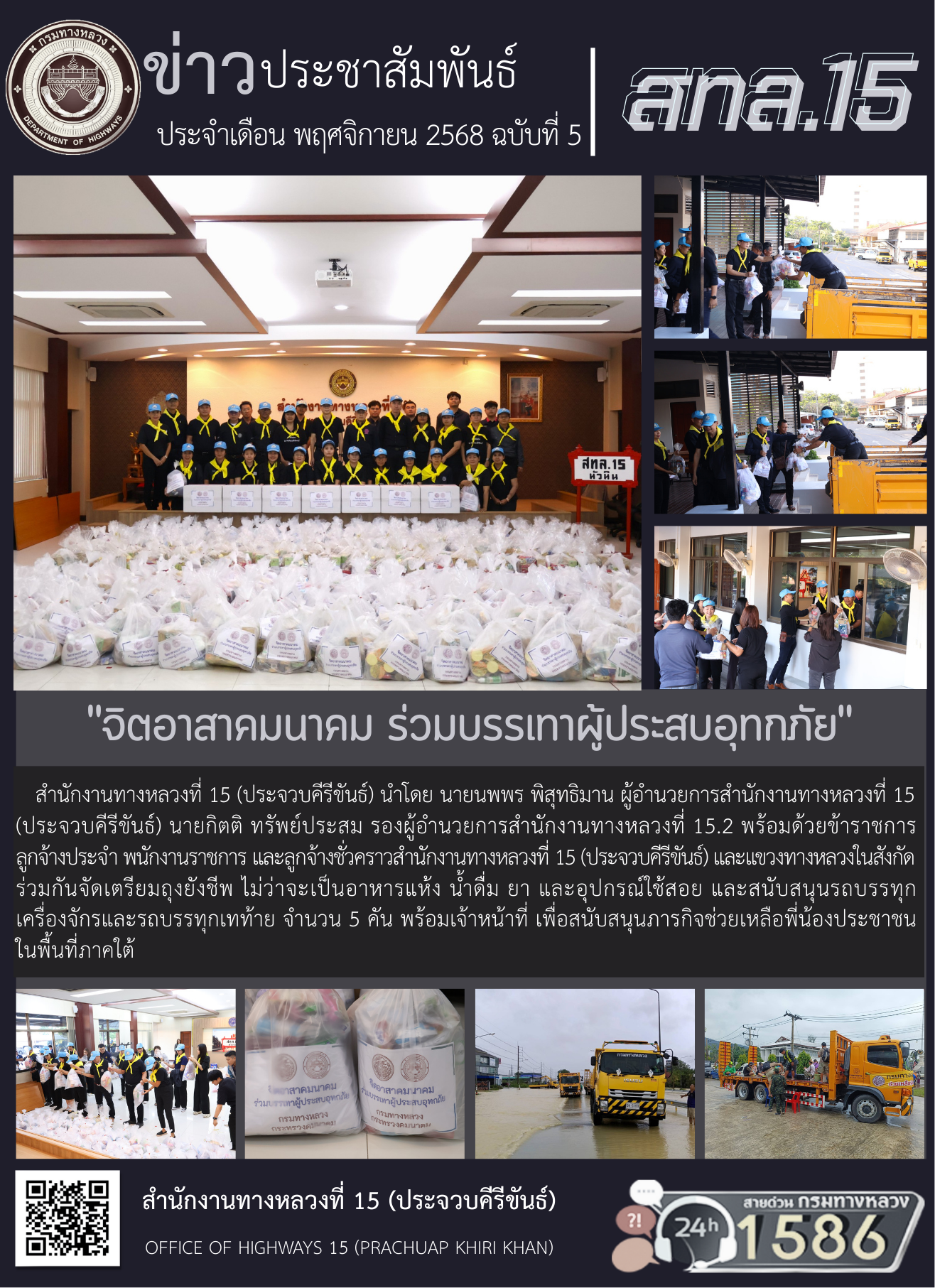 สำนักงานทางหลวงที่ 15 (ประจวบคีรีขันธ์) นำโดย นายนพพร พิสุทธิมาน ผู้อำนวยการสำนักงานทางหลวงที่ 15 (ประจวบคีรีขันธ์) นายกิตติ ทรัพย์ประสม รองผู้อำนวยการสำนักงานทางหลวงที่ 15.2 พร้อมด้วยข้าราชการ ลูกจ้างประจำ พนักงานราชการ และลูกจ้างชั่วคราวสำนักงานทางหลวงที่ 15 (ประจวบคีรีขันธ์) และแขวงทางหลวงในสังกัด ร่วมกันจัดเตรียมถุงยังชีพ ไม่ว่าจะเป็นอาหารแห้ง น้ำดื่ม ยา และอุปกรณ์ใช้สอย และสนับสนุนรถบรรทุกเครื่องจักรและรถบรรทุกเทท้าย จำนวน 5 คัน พร้อมเจ้าหน้าที่ เพื่อสนับสนุนภารกิจช่วยเหลือพี่น้องประชาชนในพื้นที่ภาคใต้
