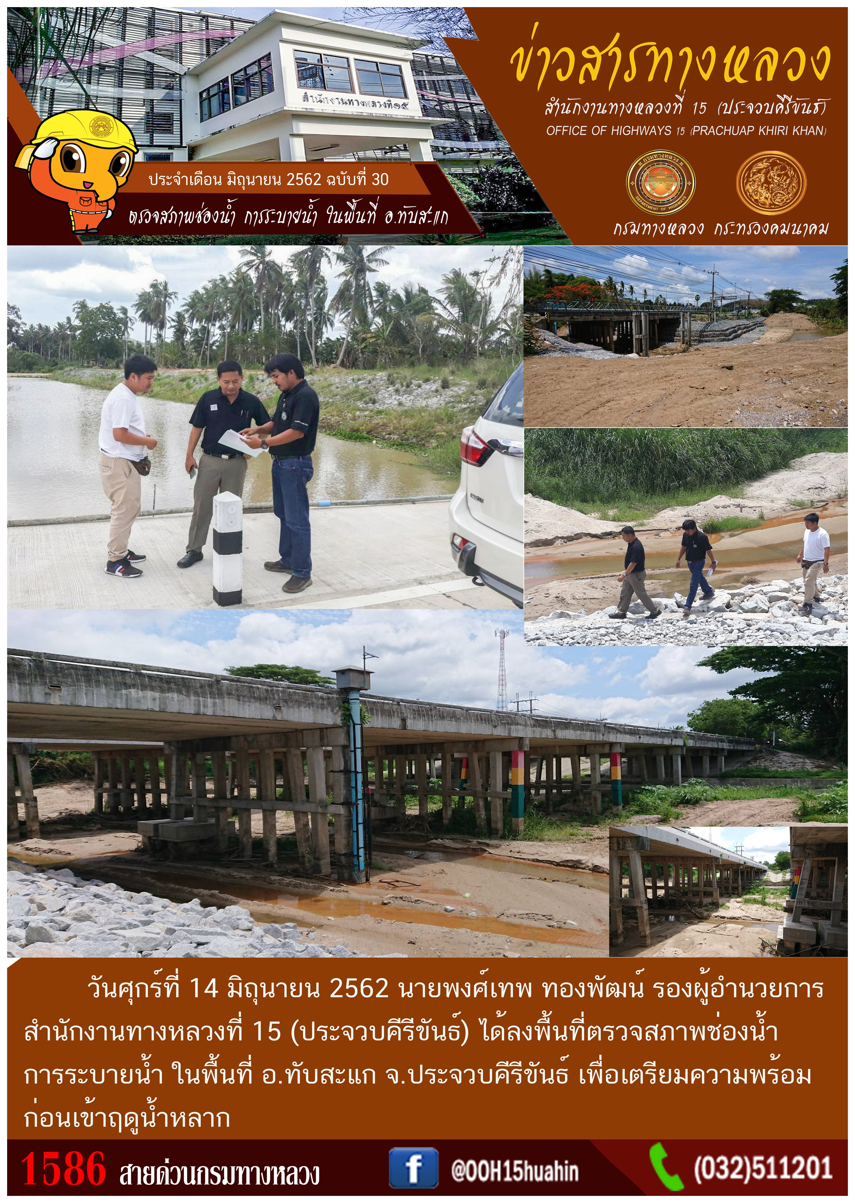 วันศุกร์ที่ 14 มิถุนายน 2562 นายพงศ์เทพ ทองพัฒน์ รองผู้อำนวยการสำนักงานทางหลวงที่ 15 (ประจวบคีรีขันธ์) ได้ลงพื้นที่ตรวจสภาพช่องน้ำ การระบายน้ำ ในพื้นที่ อ.ทับสะแก จ.ประจวบคีรีขันธ์ เพื่อเตรียมความพร้อมก่อนเข้าฤดูน้ำหลาก