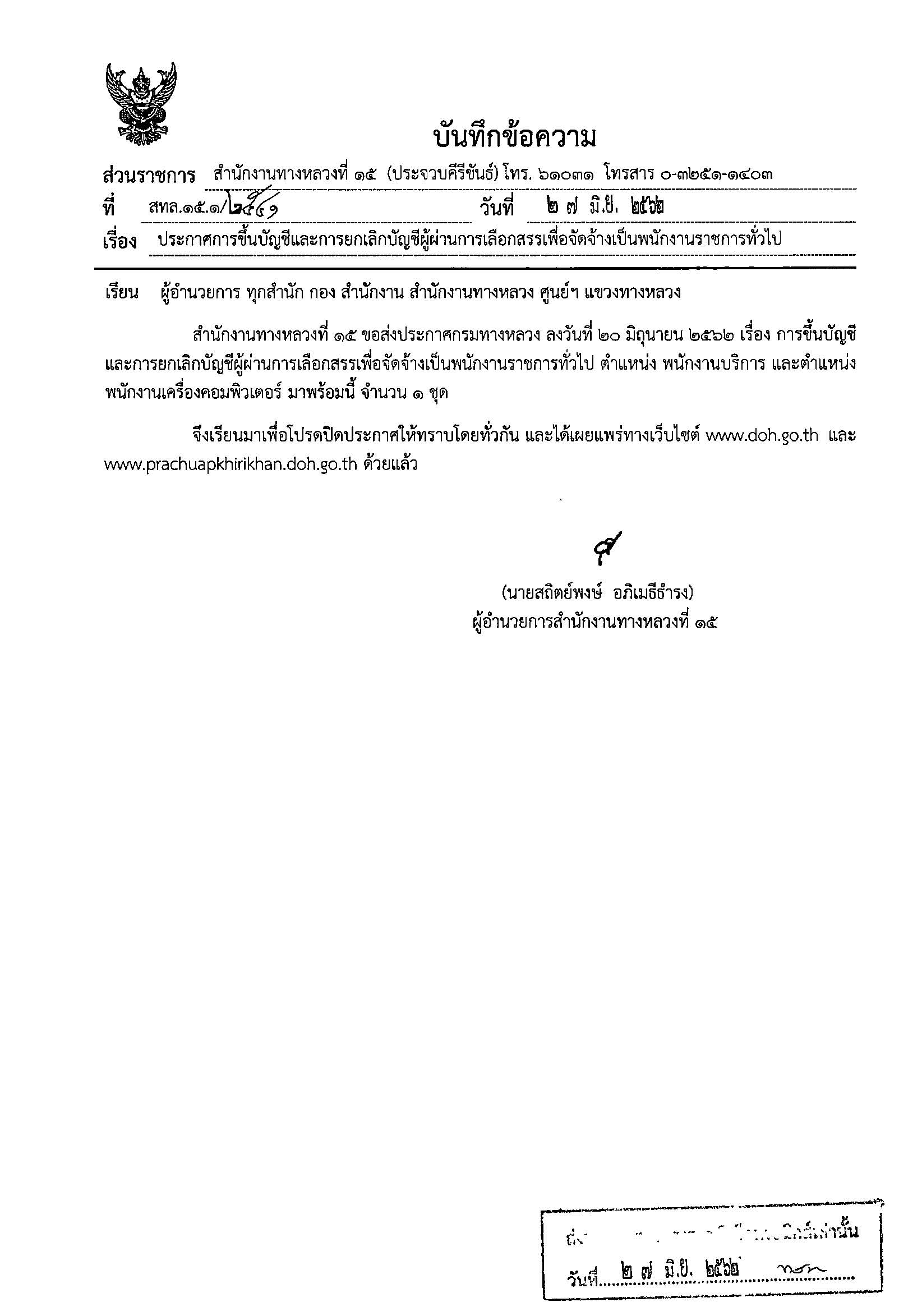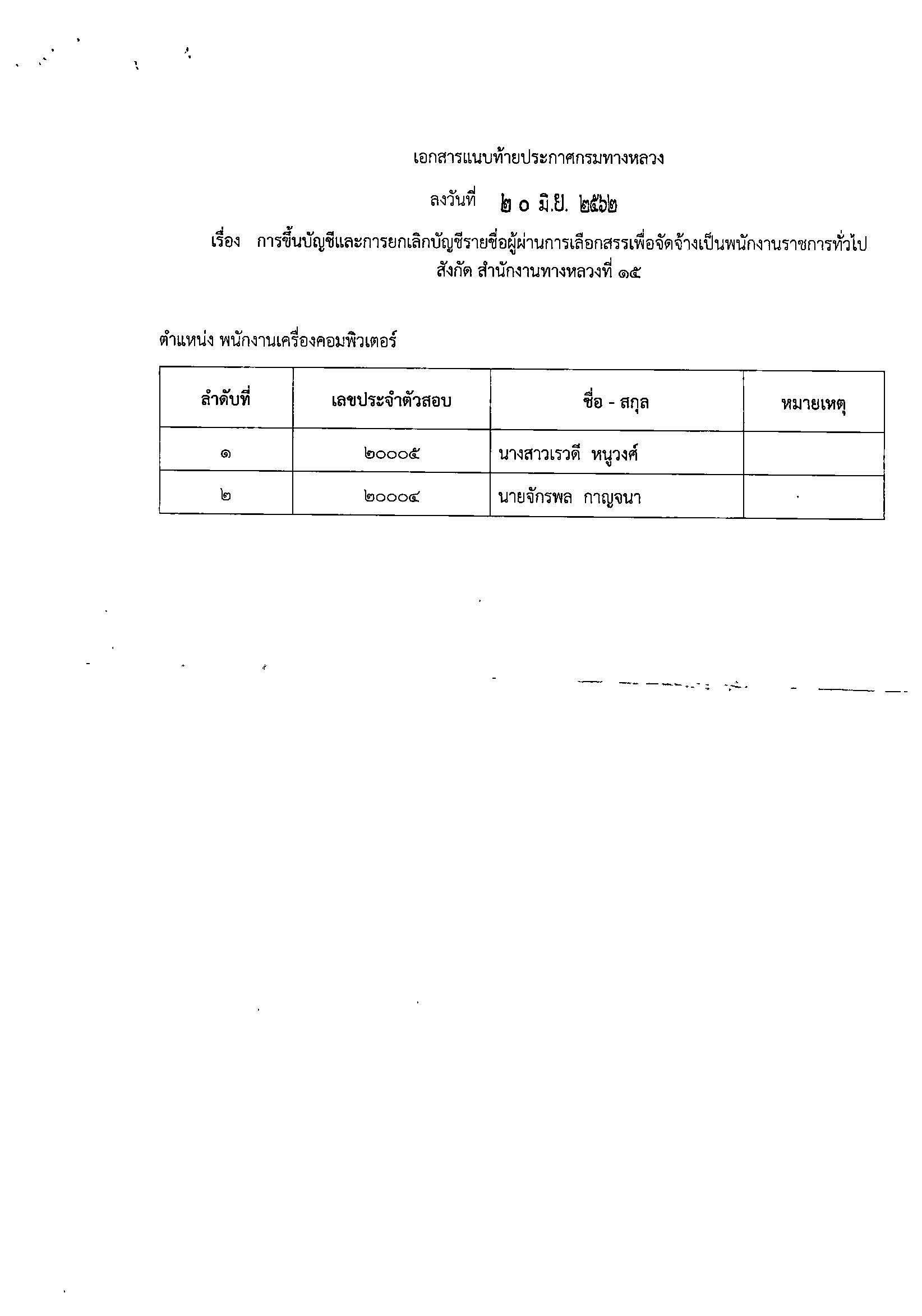 ตำแหน่งพนักงานเครื่องคอมพิวเตอร์ สังกัดสำนักงานทางหลวงที่ 15 จำนวน 1 อัตรา